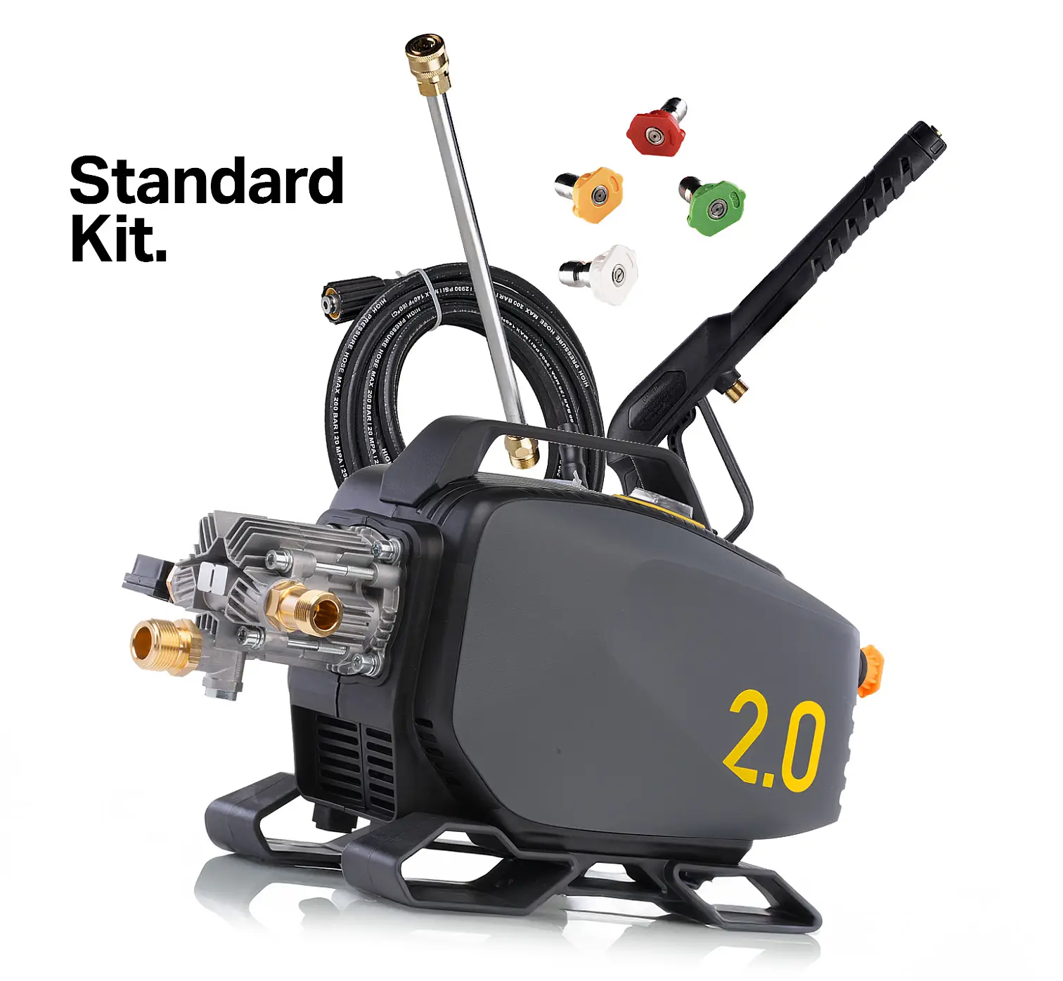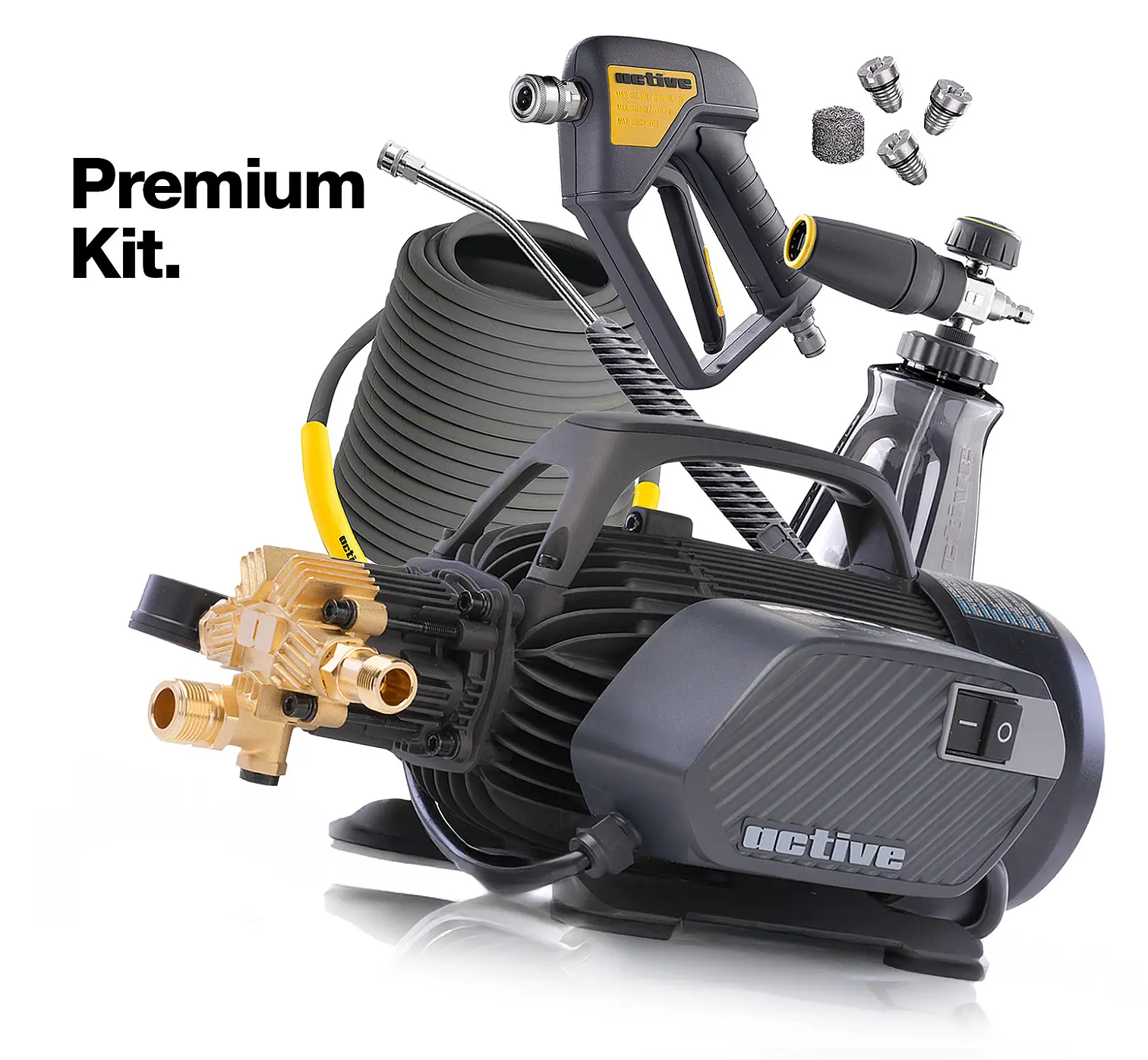 Active 2.3 on varustatud täiustatud 5-kolvilise Pro Pump vaskotsaplaadiga ja 128 induktsioonmootoriga, mis tagab jõudluse 2.3 GPM @ 1100 PSI.